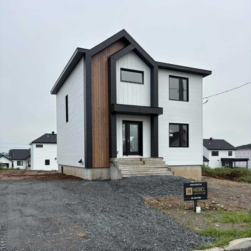 Une maison modèle de style scandinave au design audacieux et contemporain. Le modèle Alison se distingue par son revêtement extérieur plus foncé, qui lui confère une allure moderne, élégante et distinctive. La profondeur des boîtes en fibrociment ainsi que la présence accrue de revêtement d’acier effet bois viennent réchauffer l’ensemble et lui donner encore plus de caractère.